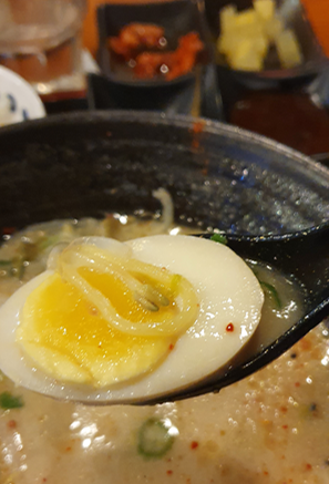 라멘에는 고기 한점과 계란 반알이 들어가있어요!