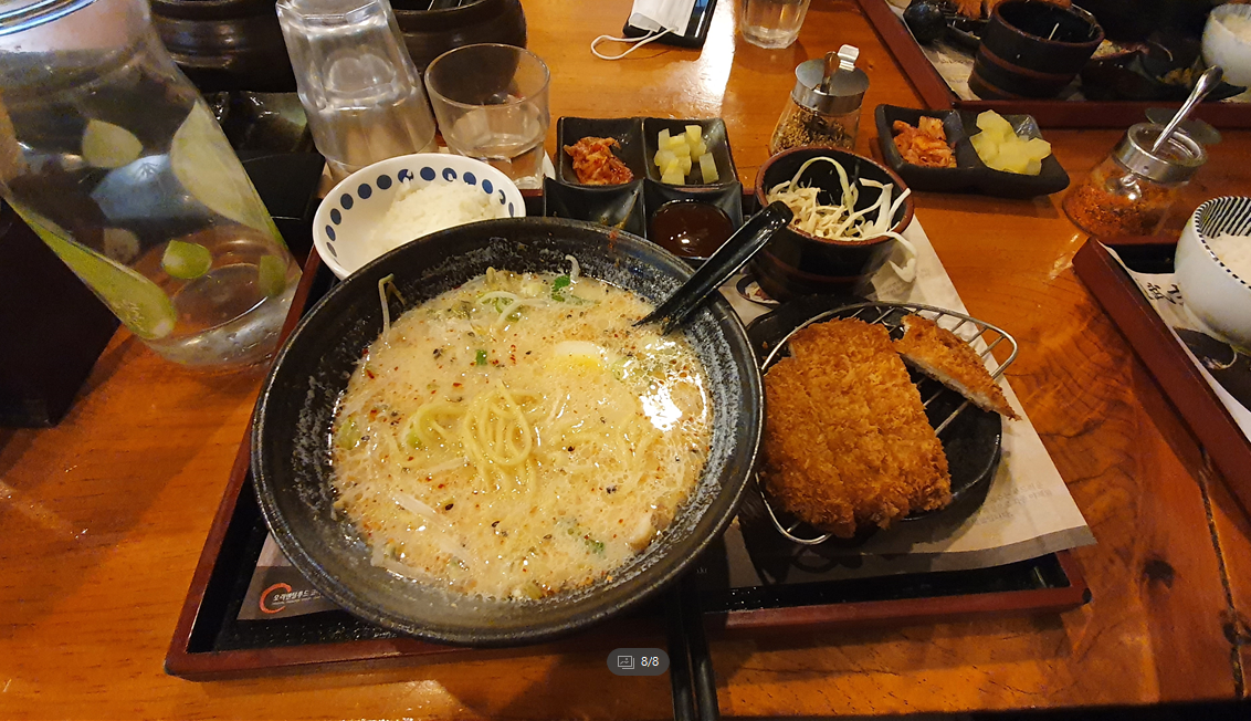앞서 말씀드린것처럼 샐러드, 밥, 돈가스, 라멘이 쟁반에 담겨서 나와요!