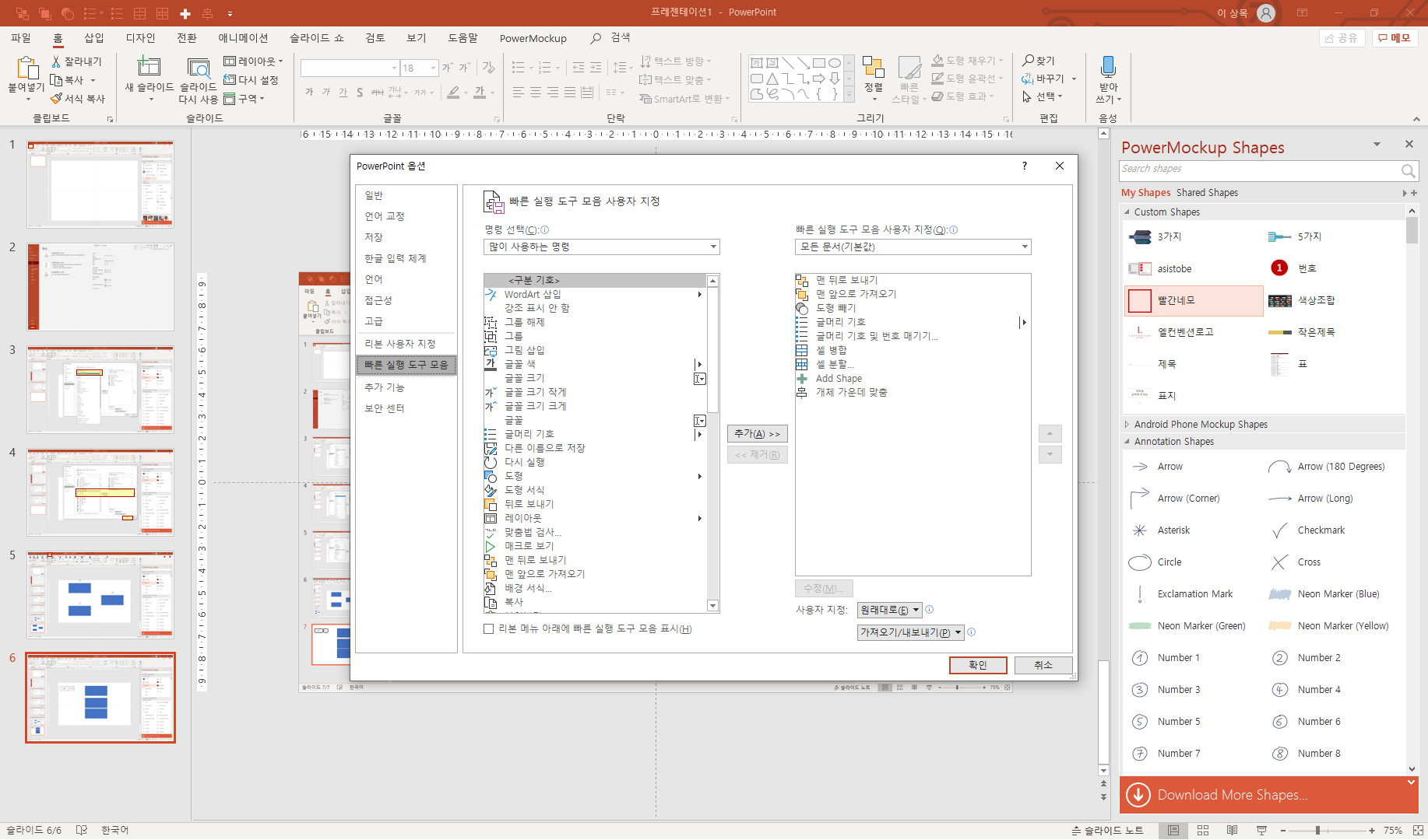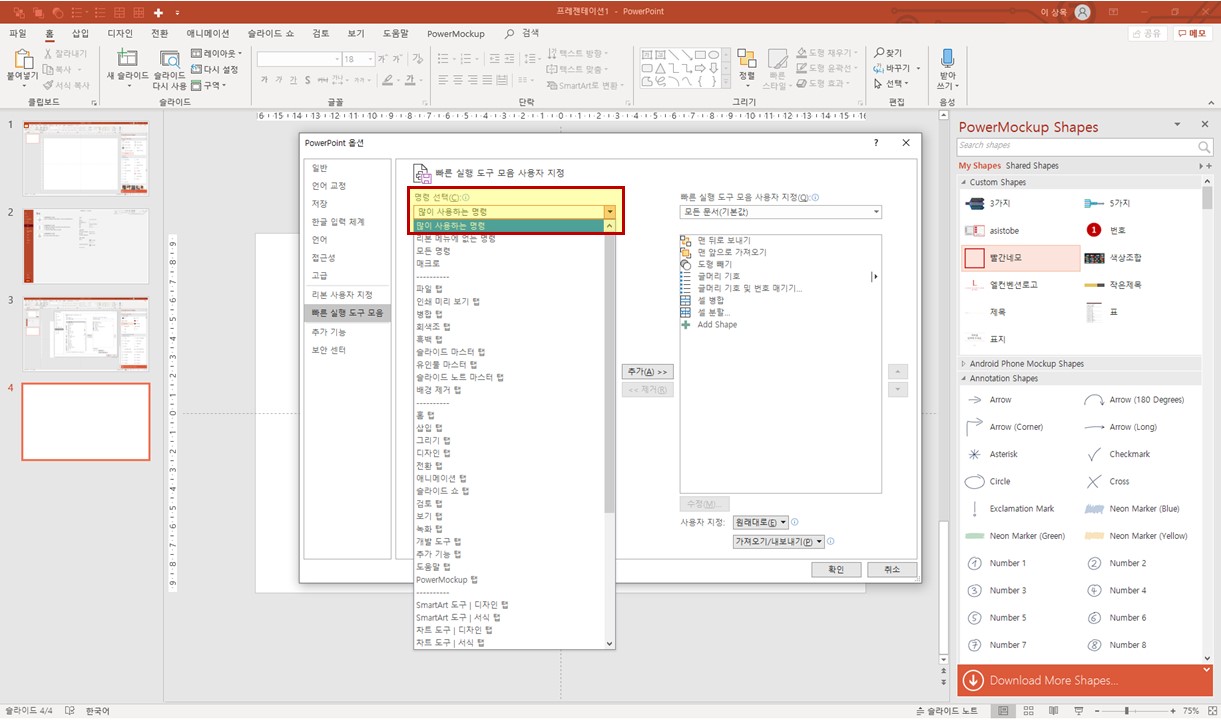 추가버튼을 통해 우측 "빠른 실행 도구 모음 사용자 지정"