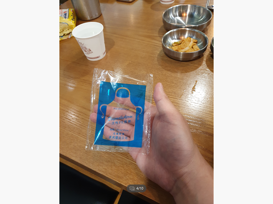 작은 비닐봉투에 포장된 일회용 비닐 앞치마를 주셨어요!