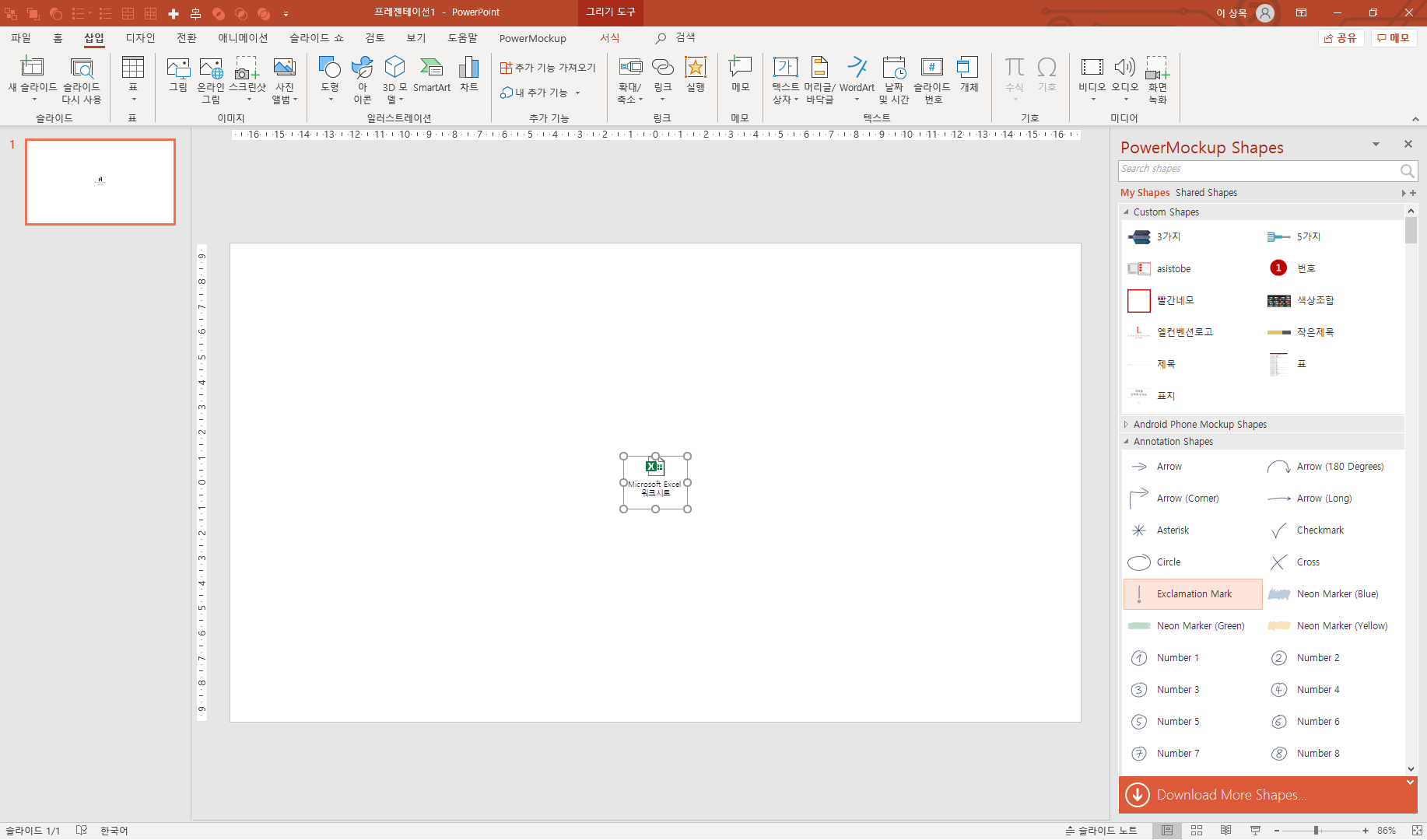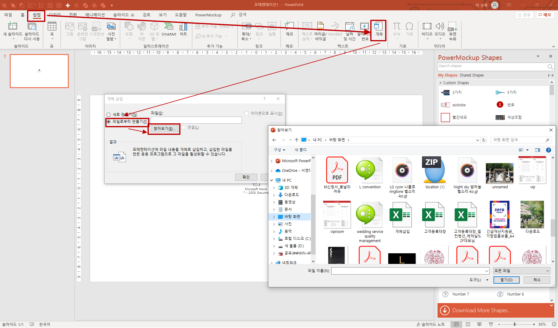 두번째는 이미 작성되어있는 파일을 피피티 슬라이드에 첨부하는 것입니다.