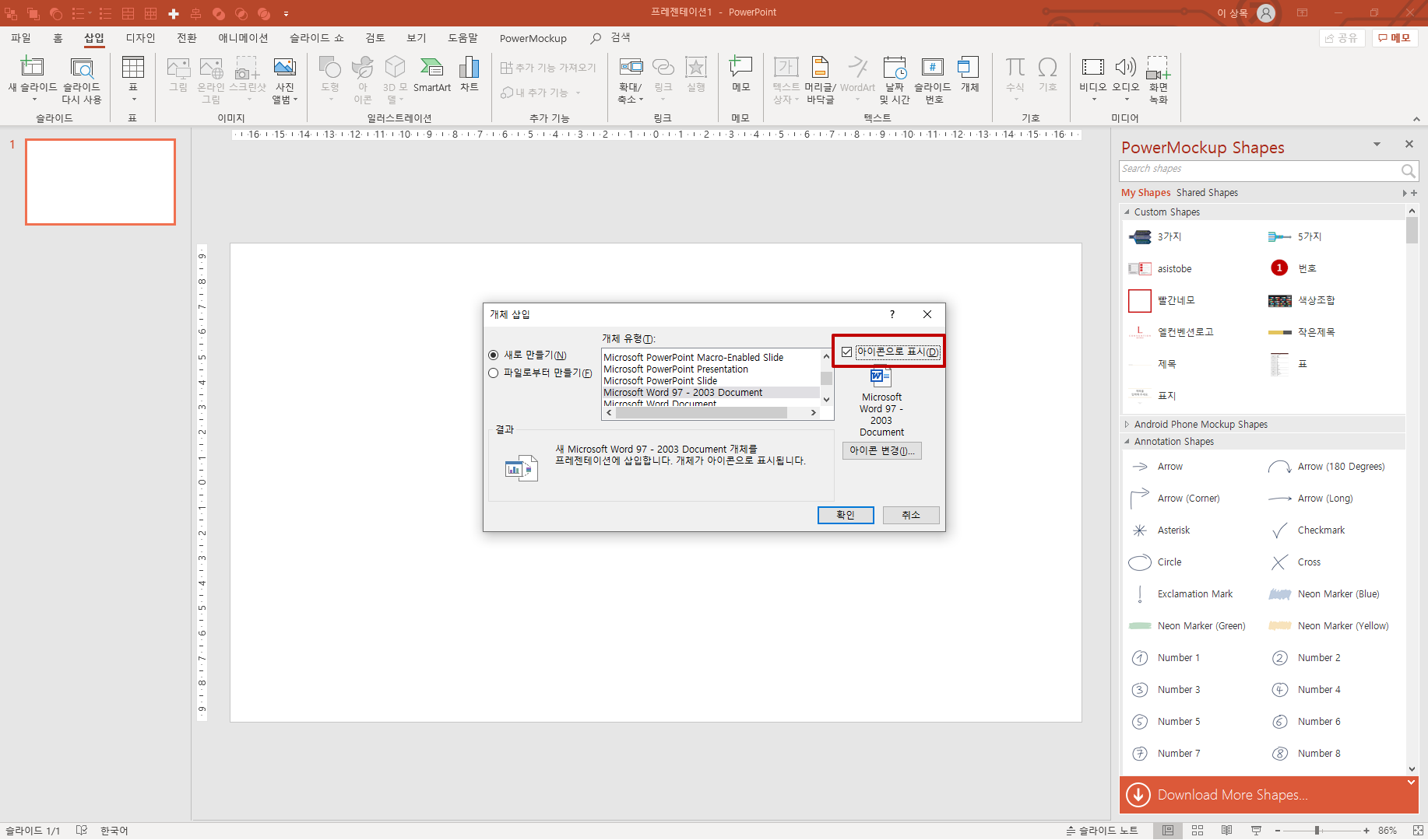 개체삽입 시 아이콘으로 만들기를 선택하면, 슬라이드에 삽입된 개체의 아이콘이 생겨납니다.