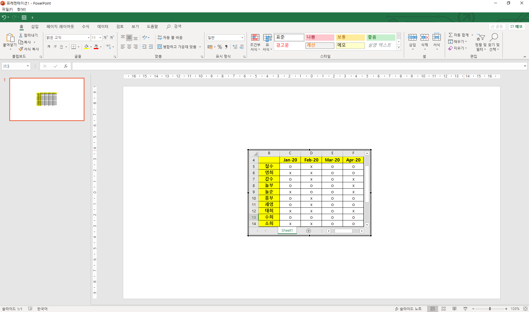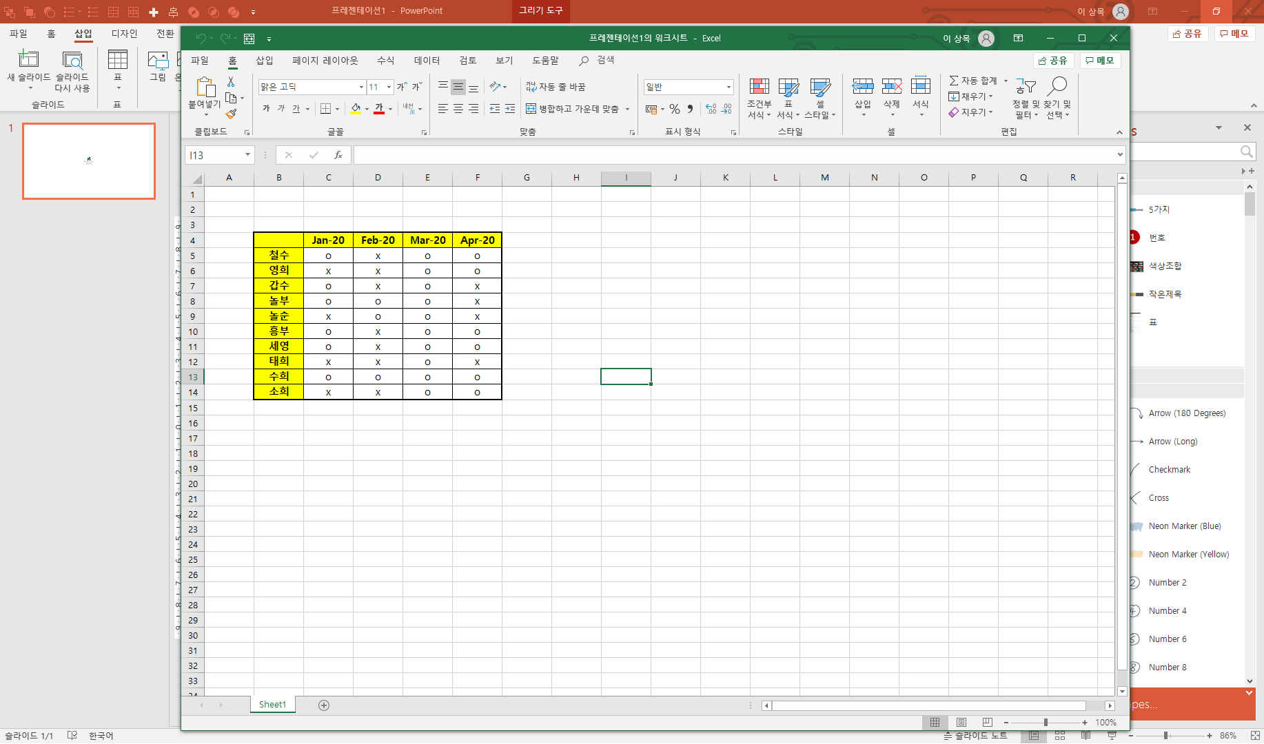 생성된 개체를 더블클릭하면 해당 기능(엑셀, 워드 등)을 실행시켜 수정할 수 있으며, 슬라이드 빈공간을 더블클릭하여 피피티 슬라이드로 돌아갈 수 있습니다.