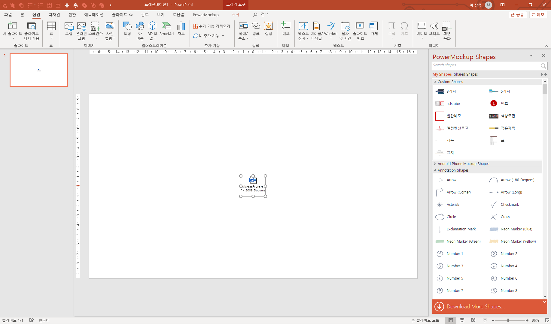 실행된 워드 창에서 텍스트를 입력하고 저장하면, 슬라이드 위에 아이콘에 저장이 되고,