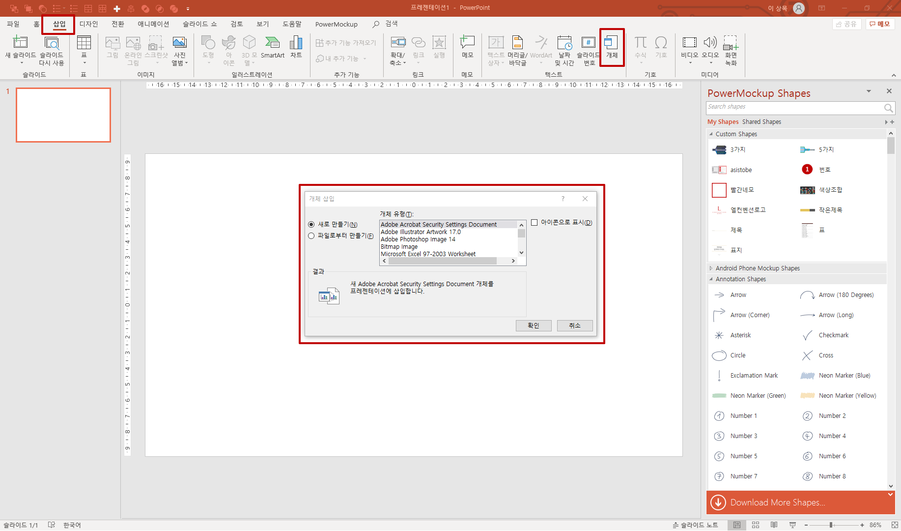 개체삽입은 리본탭의 [삽입]->[개체] 버튼을 통해 실행할 수 있습니다.