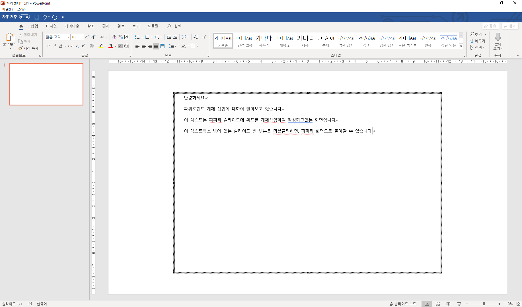 텍스트박스 바깥 부분을 더블클릭하여 파워포인트 슬라이드 화면으로 돌아온 화면입니다.