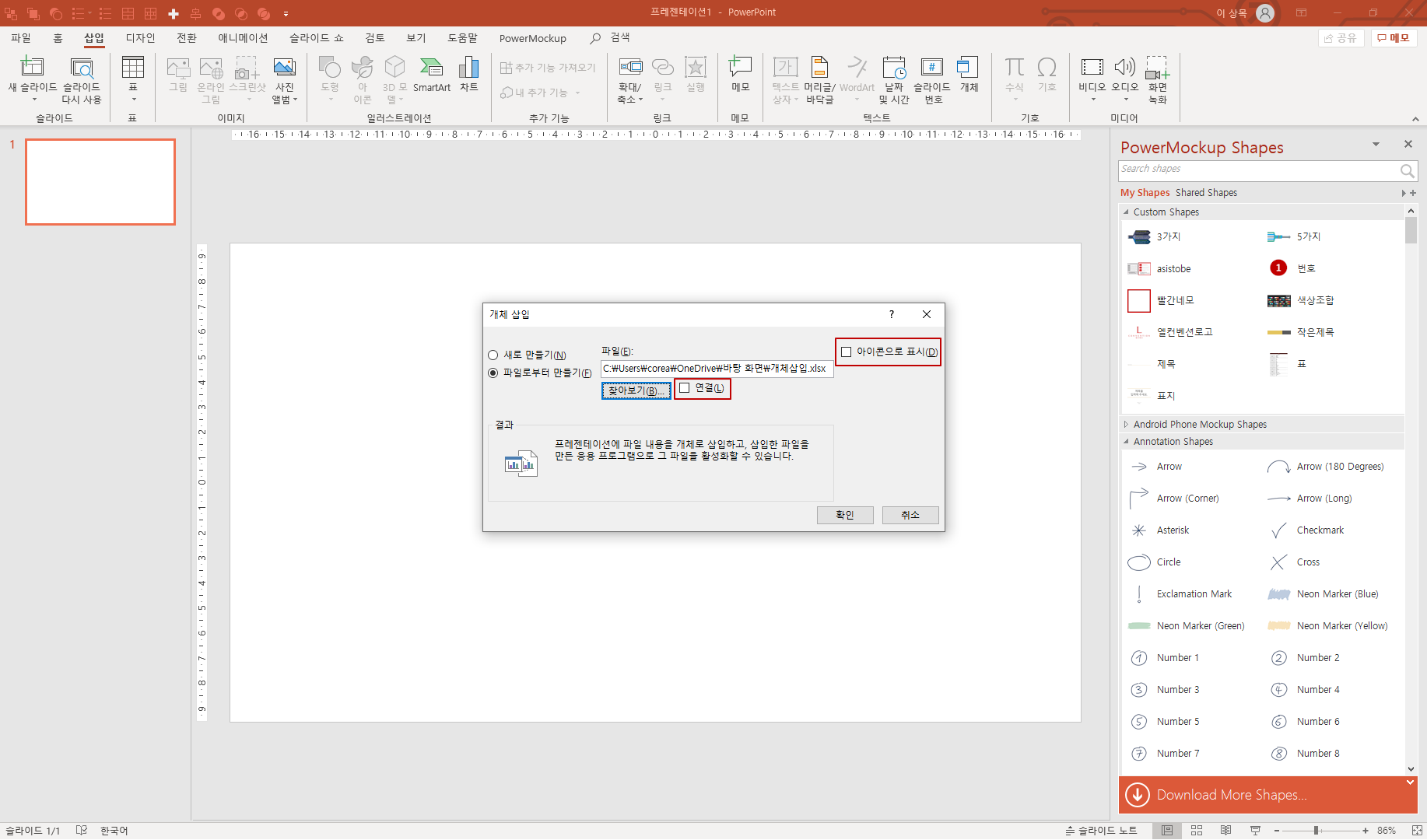 아이콘으로 표시 기능을 선택하지 않으면, 슬라이드 안에 선택한 개체의 화면이 바로 나타나며, 더블클릭하여 작성할 수 있습니다.