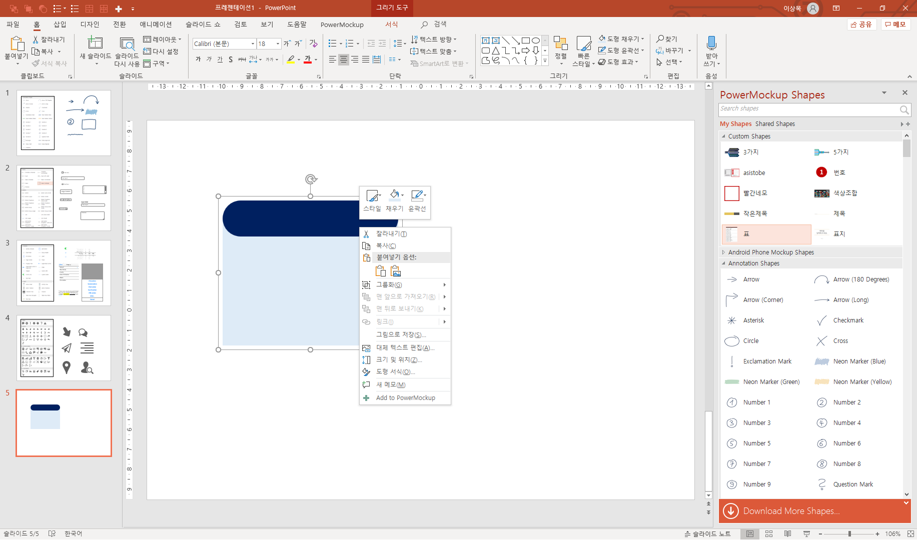 자 우측 화면에 이렇게 파워목업의 Shapes들이 나타나있습니다!